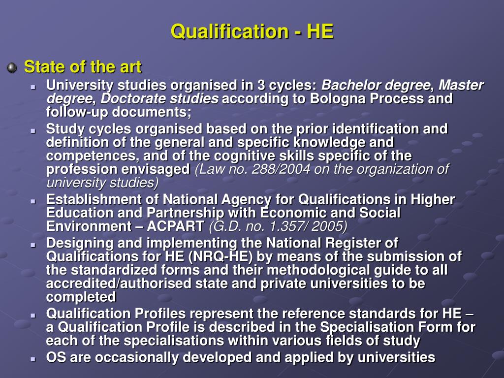 Qualification - HE • State of the art • University studies organised in 3 cycles: Bachelor degree, Master degree, Doctorate studies according to Bologna Process and follow-up documents; • Study cycles organised based on the prior identification and definition of the general and specific knowledge and competences, and of the cognitive skills specific of the profession envisaged (Law no. 288/2004 on the organization of university studies) • Establishment of National Agency for Qualifications in Higher Education and Partnership with Economic and Social Environment – ACPART(G.D. no. 1.357/ 2005) • Designing and implementing the National Register of Qualifications for HE (NRQ-HE) by means of the submissionof the standardized forms and their methodological guide to all accredited/authorised state and private universities to be completed • Qualification Profiles represent the reference standards for HE– a Qualification Profile is described in the Specialisation Form for each of the specialisations within various fields of study • OS are occasionally developed and applied by universities