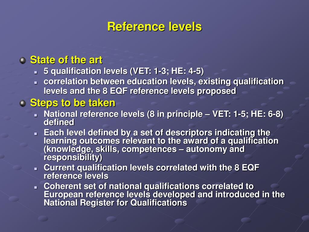 Reference levels • State of the art • 5 qualification levels (VET: 1-3; HE: 4-5) • correlation between education levels, existing qualification levels and the 8 EQF reference levels proposed • Steps to be taken • National reference levels (8 in principle – VET: 1-5; HE: 6-8) defined • Each level defined by a set of descriptors indicating the learning outcomes relevant to the award of a qualification (knowledge, skills,competences – autonomy and responsibility) • Current qualification levels correlated with the 8 EQF reference levels • Coherent set of national qualifications correlated to European reference levels developedand introduced in the National Register for Qualifications