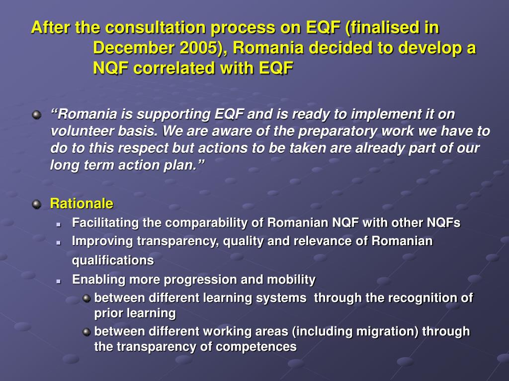 After the consultation process on EQF (finalised in December 2005), Romania decided to develop a NQF correlated with EQF • “Romania is supporting EQF and is ready to implement it on volunteer basis. We are aware of the preparatory work we have to do to this respect but actions to be taken are already part of our long term action plan.” • Rationale • Facilitating the comparability of Romanian NQF with other NQFs • Improving transparency, quality and relevance of Romanian qualifications • Enabling more progression and mobility • between different learning systems through the recognition of prior learning • between different working areas (including migration) through the transparency of competences