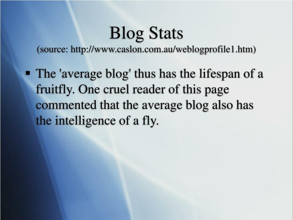 Blog Stats (source: http://www.caslon.com.au/weblogprofile1.htm) • The 'average blog' thus has the lifespan of a fruitfly. One cruel reader of this page commented that the average blog also has the intelligence of a fly.