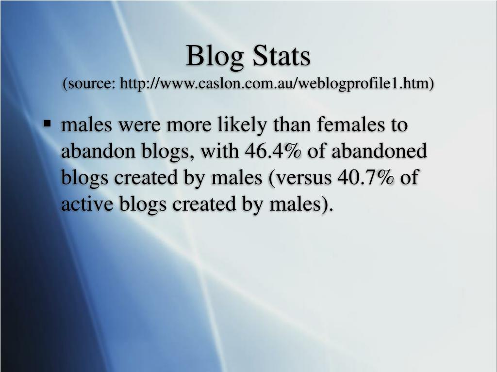 Blog Stats (source: http://www.caslon.com.au/weblogprofile1.htm) • males were more likely than females to abandon blogs, with 46.4% of abandoned blogs created by males (versus 40.7% of active blogs created by males).