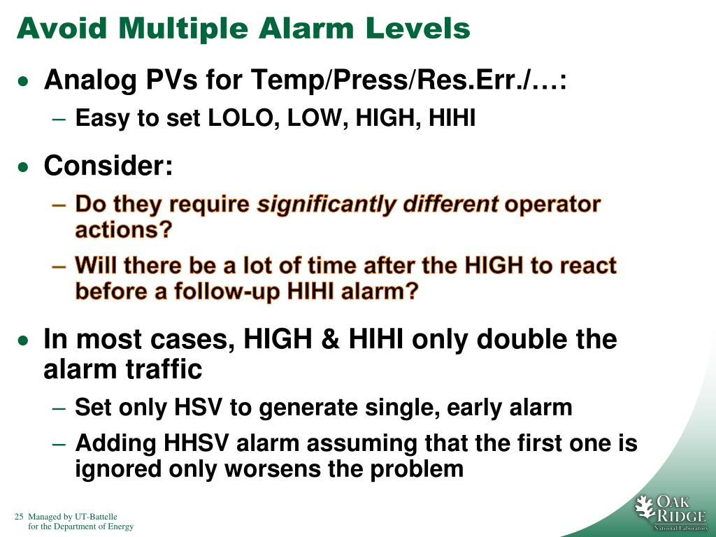 Avoid Multiple Alarm Levels Analog PVs for Temp/Press/Res.Err./…: Easy to set LOLO, LOW, HIGH, HIHI Consider: Do they require significantly different operator actions? Will there be a lot of time after the HIGH to react before a follow-up HIHI alarm? In most cases, HIGH & HIHI only double the alarm traffic Set only HSV to generate single, early alarm Adding HHSV alarm assuming that the first one is ignored only worsens the problem