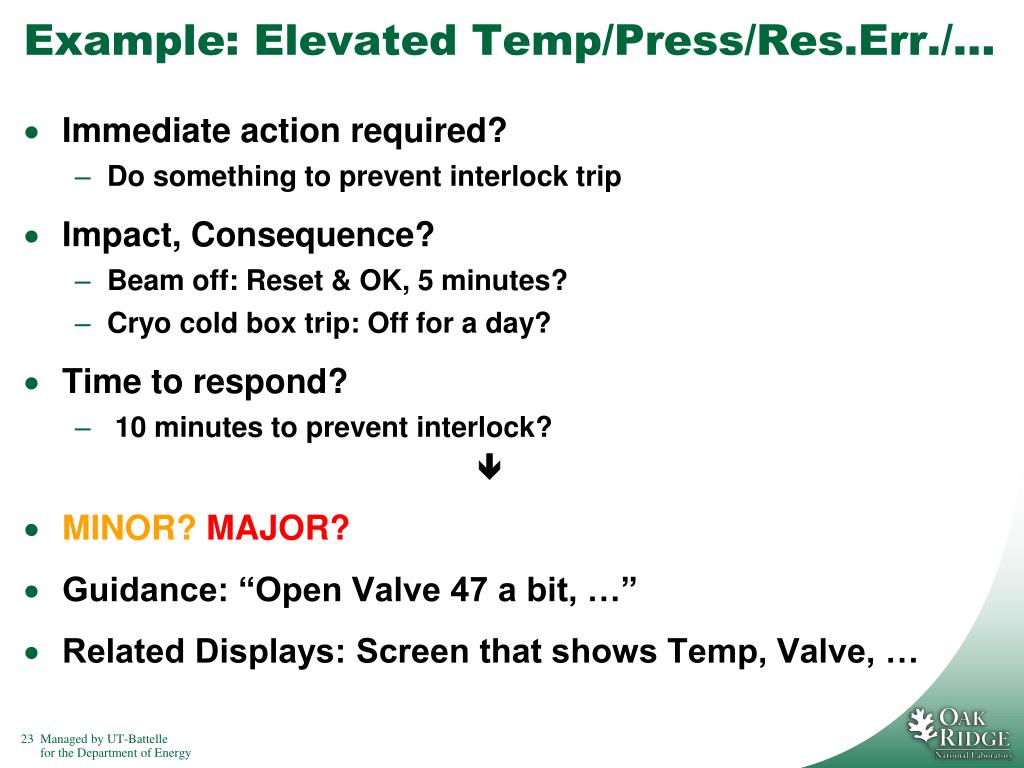Example: Elevated Temp/Press/Res.Err./… Immediate action required? Do something to prevent interlock trip Impact, Consequence? Beam off: Reset & OK, 5 minutes? Cryo cold box trip: Off for a day? Time to respond? 10 minutes to prevent interlock? MINOR? MAJOR? Guidance: “Open Valve 47 a bit, …” Related Displays: Screen that shows Temp, Valve, …