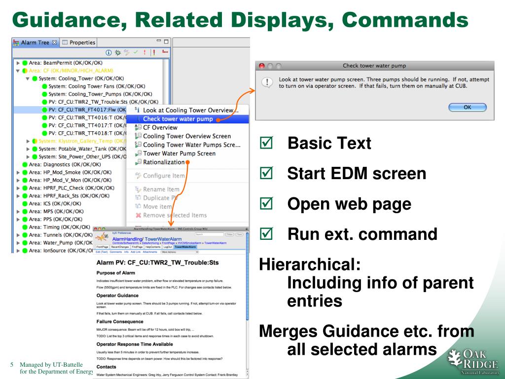 Guidance, Related Displays, Commands • Basic Text • Start EDM screen • Open web page • Run ext. command Hierarchical:Including info of parent entries Merges Guidance etc. from all selected alarms