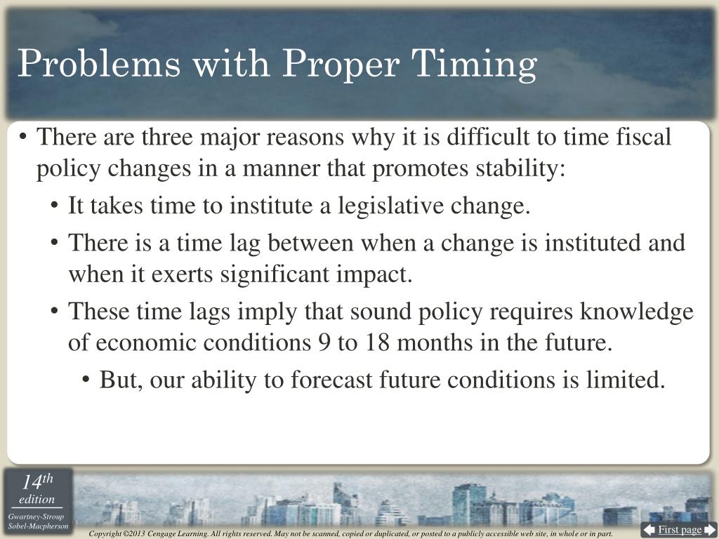 Problems with Proper Timing • There are three major reasons why it is difficult to time fiscal policy changes in a manner that promotes stability: • It takes time to institute a legislative change. • There is a time lag between when a change is instituted and when it exerts significant impact. • These time lags imply that sound policy requires knowledge of economic conditions 9 to 18 months in the future. • But, our ability to forecast future conditions is limited.