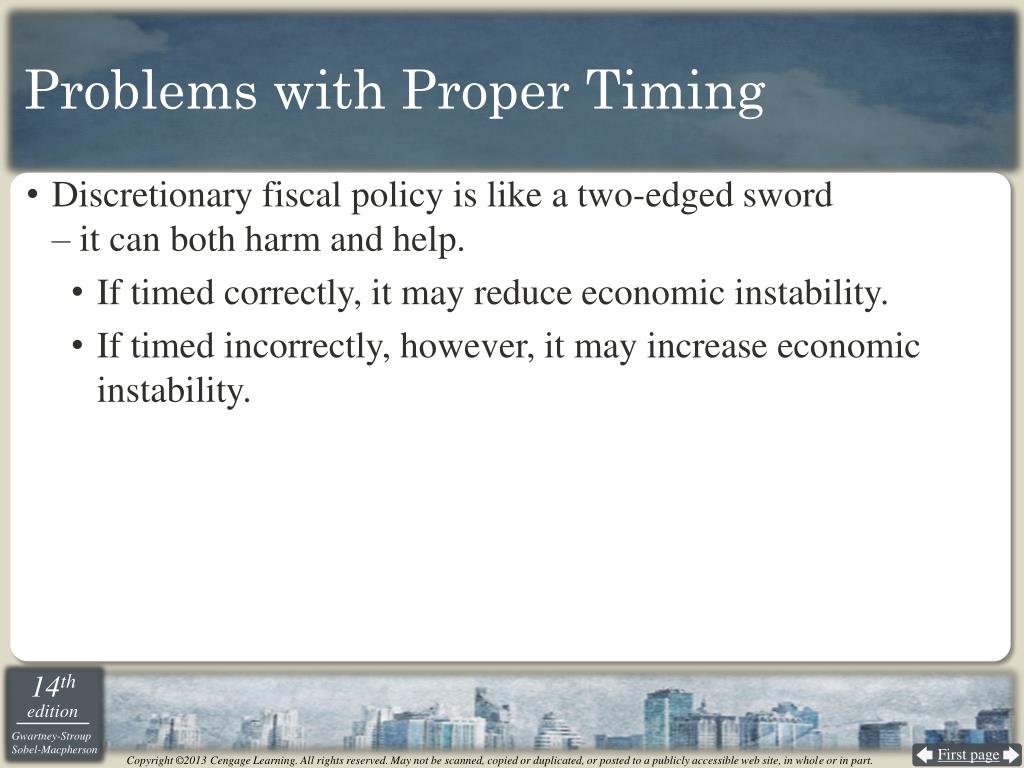 Problems with Proper Timing • Discretionary fiscal policy is like a two-edged sword – it can both harm and help. • If timed correctly, it may reduce economic instability. • If timed incorrectly, however, it may increase economic instability.