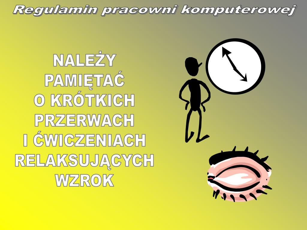 Regulamin pracowni komputerowej NALEŻY PAMIĘTAĆ O KRÓTKICH PRZERWACH I ĆWICZENIACH RELAKSUJĄCYCH WZROK