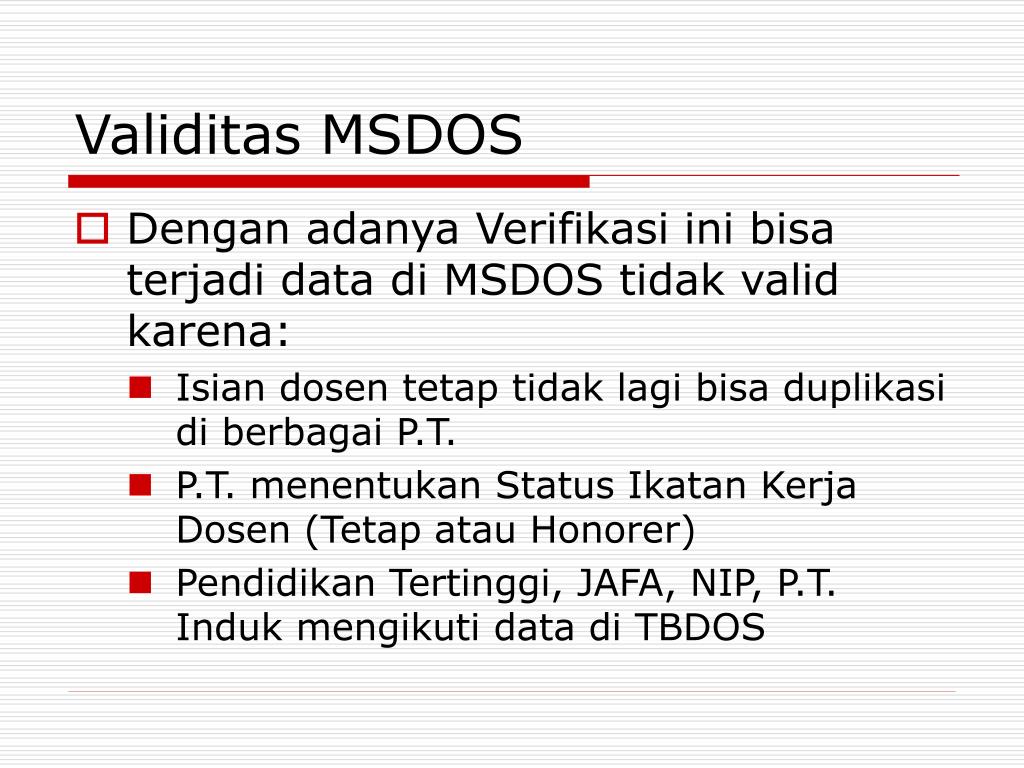 Validitas MSDOS • Dengan adanya Verifikasi ini bisa terjadi data di MSDOS tidak valid karena: • Isian dosen tetap tidak lagi bisa duplikasi di berbagai P.T. • P.T. menentukan Status Ikatan Kerja Dosen (Tetap atau Honorer) • Pendidikan Tertinggi, JAFA, NIP, P.T. Induk mengikuti data di TBDOS