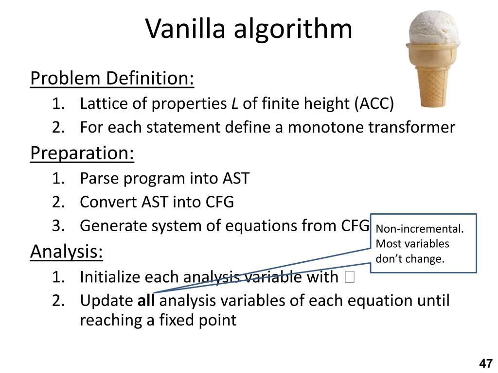 Vanilla algorithm Non-incremental. Most variables don’t change. Problem Definition: • Lattice of properties L of finite height (ACC) • For each statement define a monotone transformer Preparation: • Parse program into AST • Convert AST into CFG • Generate system of equations from CFG Analysis: • Initialize each analysis variable with • Update all analysis variables of each equation until reaching a fixed point