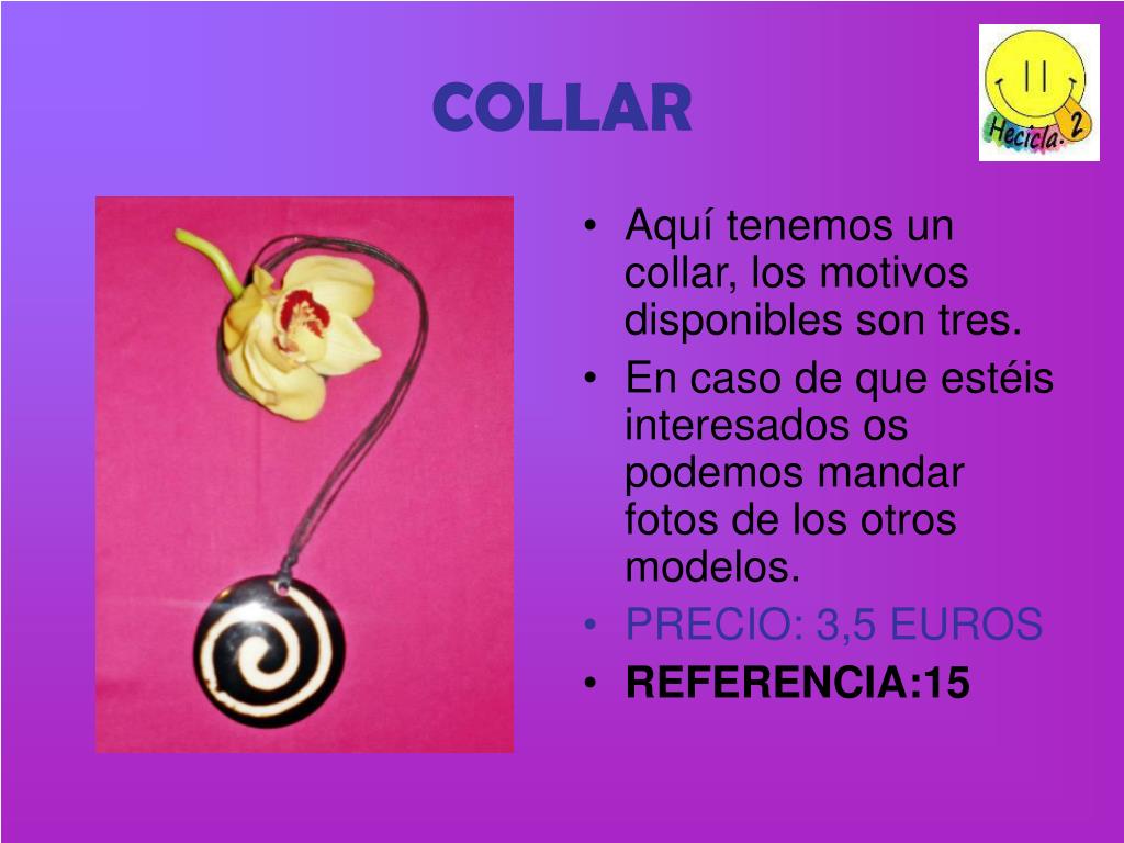 COLLAR • Aquí tenemos un collar, los motivos disponibles son tres. • En caso de que estéis interesados os podemos mandar fotos de los otros modelos. • PRECIO: 3,5 EUROS • REFERENCIA:15