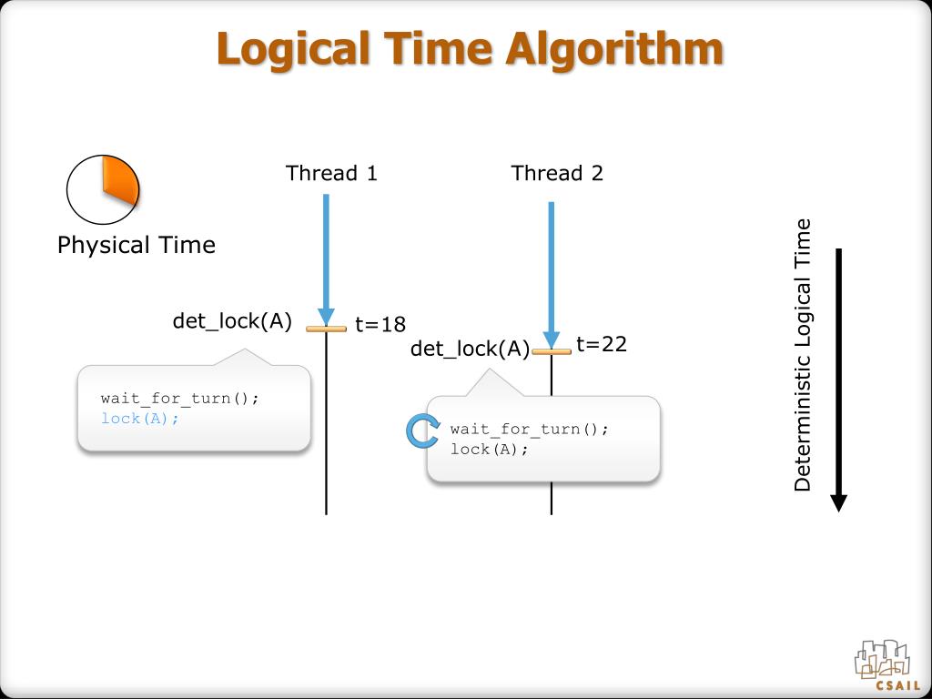Logical Time Algorithm Thread 1 Thread 2 Physical Time t=8 det_lock(A) t=18 Deterministic Logical Time