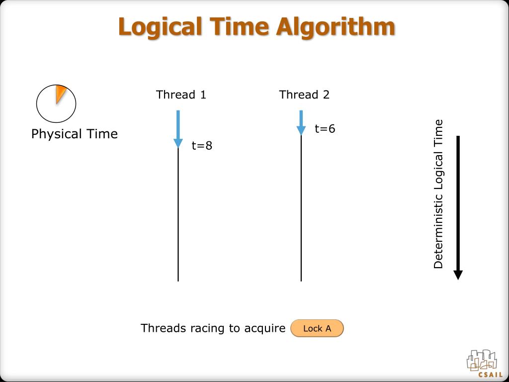Logical Time Algorithm Thread 1 Thread 2 Physical Time t=8 t=18 Deterministic Logical Time Threads racing to acquire Lock A