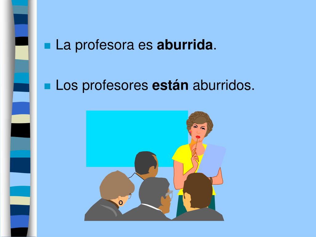 El café _____ al lado del museo. El café está al lado del museo. La señora Bronstein _____ la profesora. La señora Bronstein es la profesora.