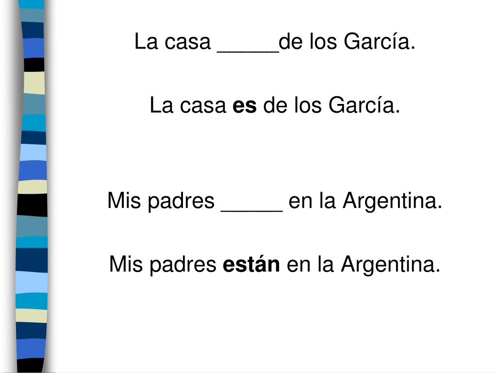 La casa _____de los García. La casa es de los García. Mis padres _____ en la Argentina. Mis padres están en la Argentina.