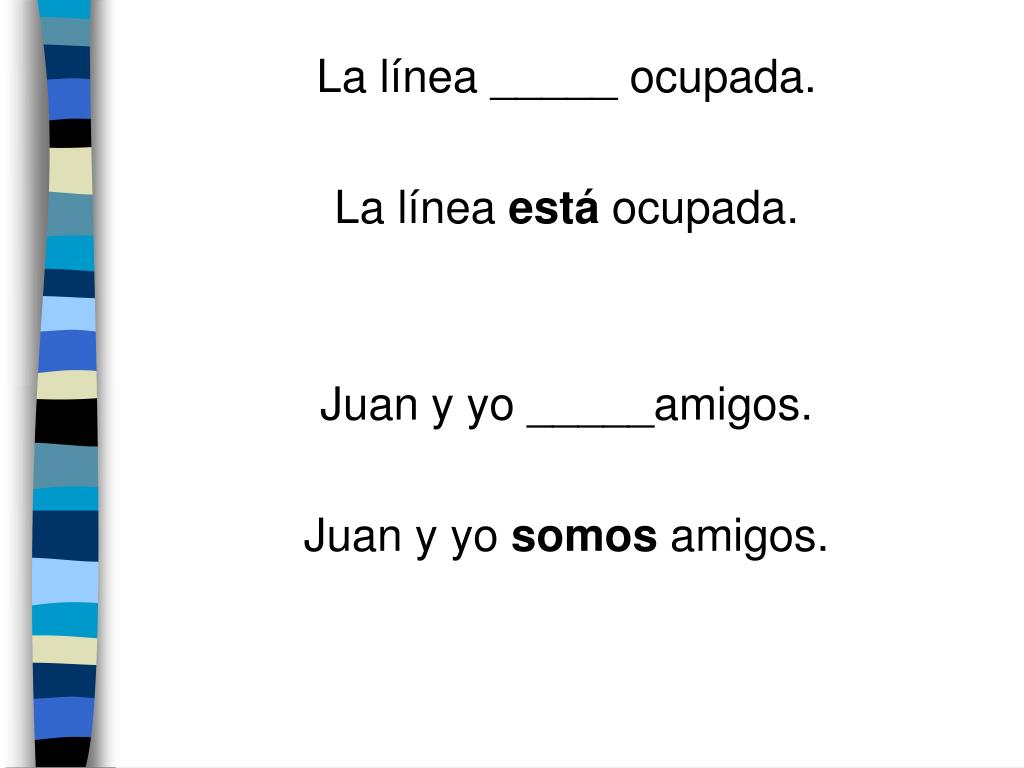 La línea _____ ocupada. La línea está ocupada. Juan y yo _____amigos. Juan y yo somos amigos.