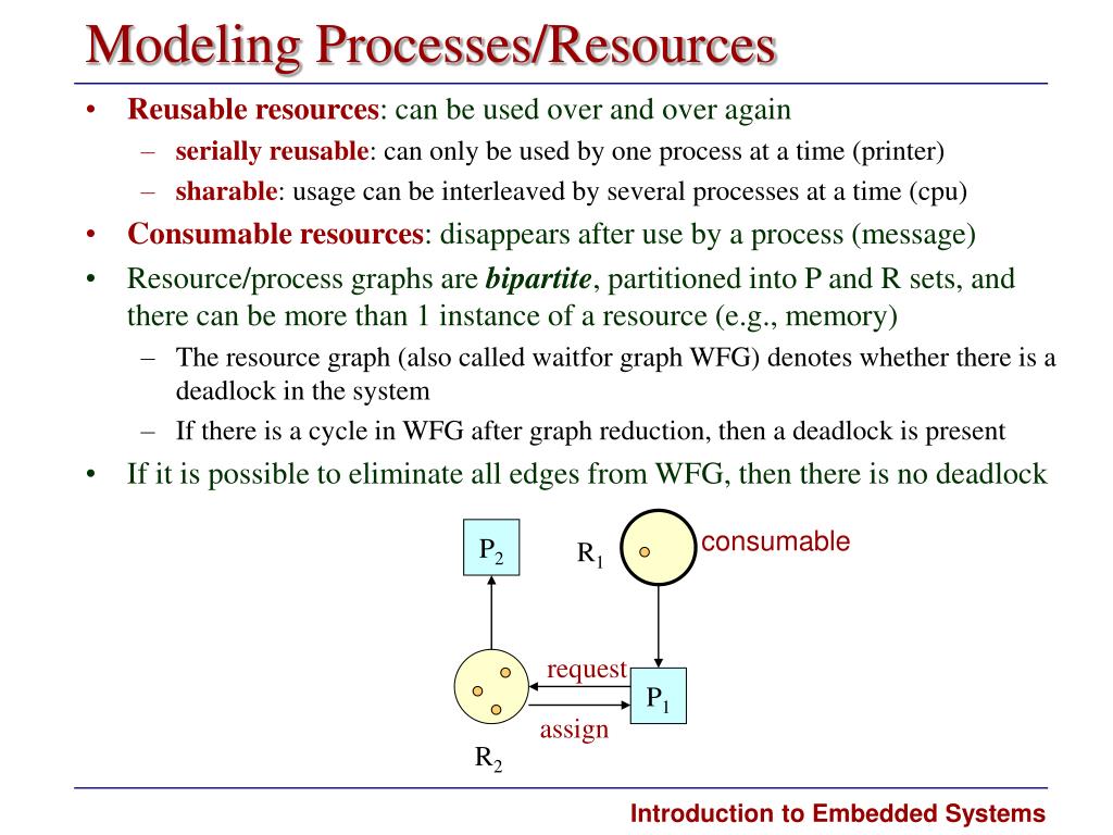 Modeling Processes/Resources • Reusable resources: can be used over and over again • serially reusable: can only be used by one process at a time (printer) • sharable: usage can be interleaved by several processes at a time (cpu) • Consumable resources: disappears after use by a process (message) • Resource/process graphs are bipartite, partitioned into P and R sets, and there can be more than 1 instance of a resource (e.g., memory) • The resource graph (also called waitfor graph WFG) denotes whether there is a deadlock in the system • If there is a cycle in WFG after graph reduction, then a deadlock is present • If it is possible to eliminate all edges from WFG, then there is no deadlock consumable P2 R1 request P1 assign R2