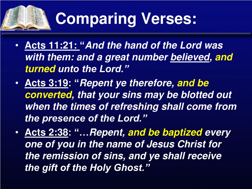 Comparing Verses: • Acts 11:21: “And the hand of the Lord was with them: and a great number believed, andturned unto the Lord.” • Acts 3:19: “Repent ye therefore, and be converted, that your sins may be blotted out when the times of refreshing shall come from the presence of the Lord.” • Acts 2:38: “…Repent, and be baptized every one of you in the name of Jesus Christ for the remission of sins, and ye shall receive the gift of the Holy Ghost.”