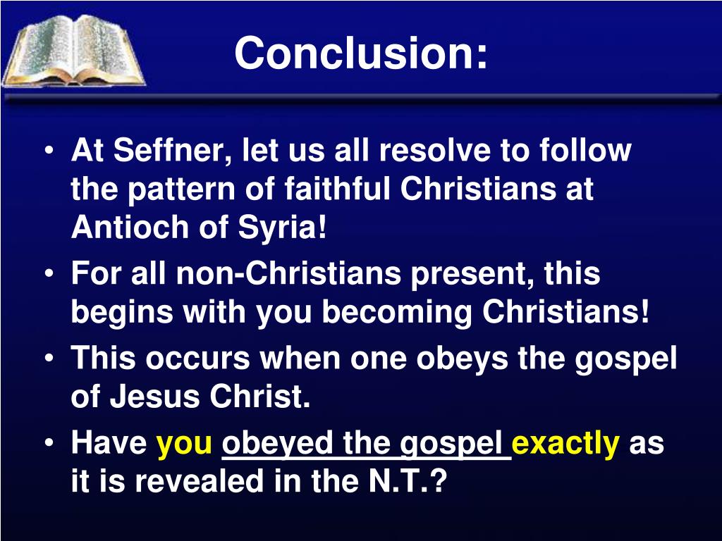 Conclusion: • At Seffner, let us all resolve to follow the pattern of faithful Christians at Antioch of Syria! • For all non-Christians present, this begins with you becoming Christians! • This occurs when one obeys the gospel of Jesus Christ. • Have youobeyed the gospel exactly as it is revealed in the N.T.?
