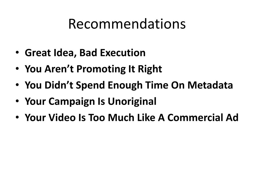 Recommendations • Great Idea, Bad Execution • You Aren’t Promoting It Right • You Didn’t Spend Enough Time On Metadata • Your Campaign Is Unoriginal • Your Video Is Too Much Like A Commercial Ad