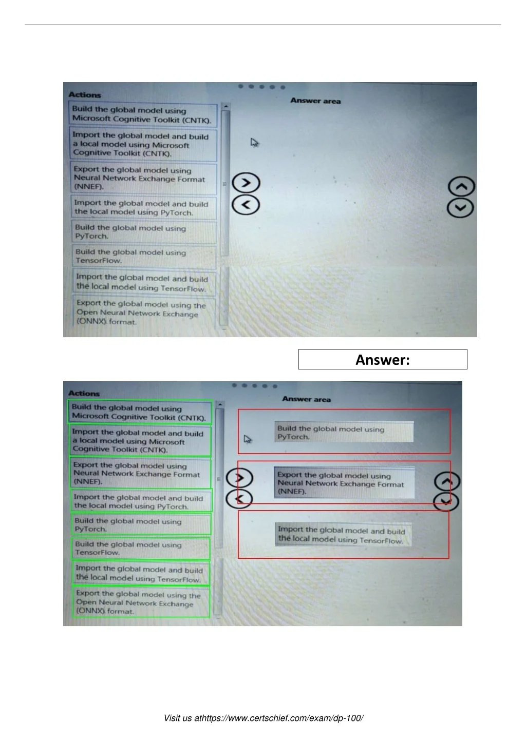 2. Latest Version: 20.0 Question: 1 You need to resolve the local machine learning pipeline performance issue. What should you do? A. Increase Graphic Processing Units (GPUs). B. Increase the learning rate. C. Increase the training iterations, D. Increase Central Processing Units (CPUs). Answer: A Question: 2 DRAG DROP You need to modify the inputs for the global penalty event model to address the bias and variance issue. Which three actions should you perform in sequence? To answer, move the appropriate actions from the list of actions to the answer area and arrange them in the correct order. Answer: Visit us athttps://www.certschief.com/exam/dp-100/