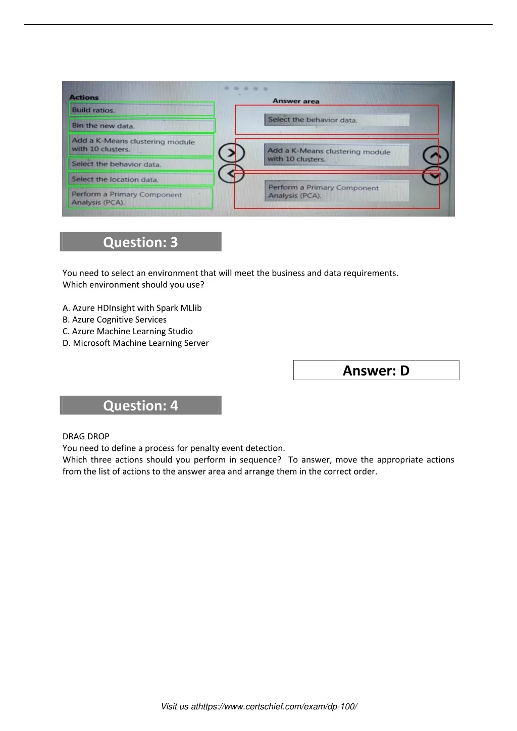 3. Question: 3 You need to select an environment that will meet the business and data requirements. Which environment should you use? A. Azure HDInsight with Spark MLlib B. Azure Cognitive Services C. Azure Machine Learning Studio D. Microsoft Machine Learning Server Answer: D Question: 4 DRAG DROP You need to define a process for penalty event detection. Which three actions should you perform in sequence? To answer, move the appropriate actions from the list of actions to the answer area and arrange them in the correct order. Visit us athttps://www.certschief.com/exam/dp-100/