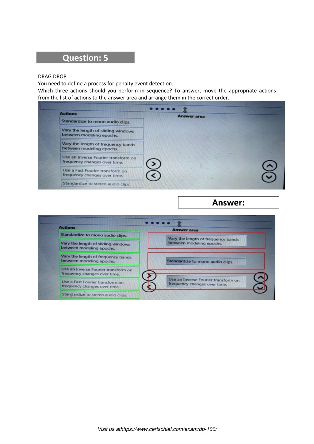 5. Question: 5 DRAG DROP You need to define a process for penalty event detection. Which three actions should you perform in sequence? To answer, move the appropriate actions from the list of actions to the answer area and arrange them in the correct order. Answer: Visit us athttps://www.certschief.com/exam/dp-100/