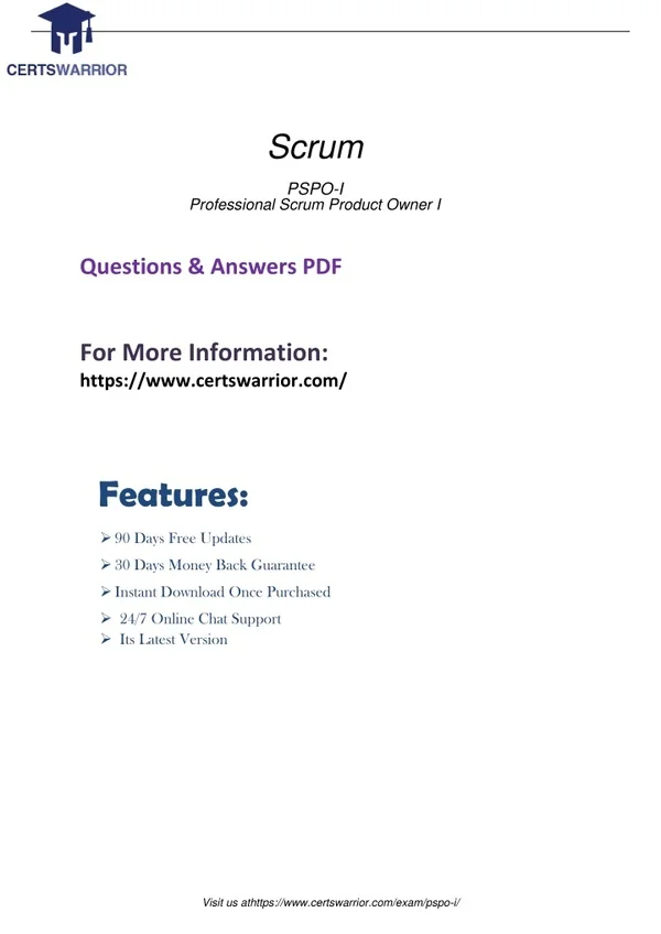 Scrum PSPO-I Professional Scrum Product Owner I Questions & Answers PDF For More Information: https://www.certswarrior.com/ Features: 90 Days Free Updates 30 Days Money Back Guarantee Instant Download Once Purchased 24/7 Online Chat Support Its Latest Version Visit us athttps://www.certswarrior.com/exam/pspo-i/