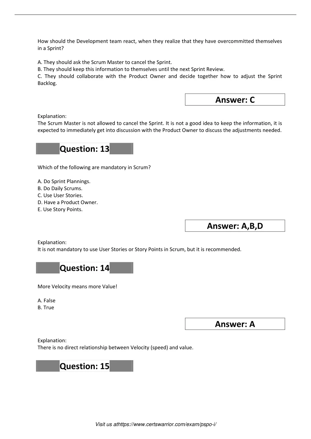 How should the Development team react, when they realize that they have overcommitted themselves in a Sprint? A. They should ask the Scrum Master to cancel the Sprint. B. They should keep this information to themselves until the next Sprint Review. C. They should collaborate with the Product Owner and decide together how to adjust the Sprint Backlog. Answer: C Explanation: The Scrum Master is not allowed to cancel the Sprint. It is not a good idea to keep the information, it is expected to immediately get into discussion with the Product Owner to discuss the adjustments needed. Question: 13 Which of the following are mandatory in Scrum? A. Do Sprint Plannings. B. Do Daily Scrums. C. Use User Stories. D. Have a Product Owner. E. Use Story Points. Answer: A,B,D Explanation: It is not mandatory to use User Stories or Story Points in Scrum, but it is recommended. Question: 14 More Velocity means more Value! A. False B. True Answer: A Explanation: There is no direct relationship between Velocity (speed) and value. Question: 15 Visit us athttps://www.certswarrior.com/exam/pspo-i/