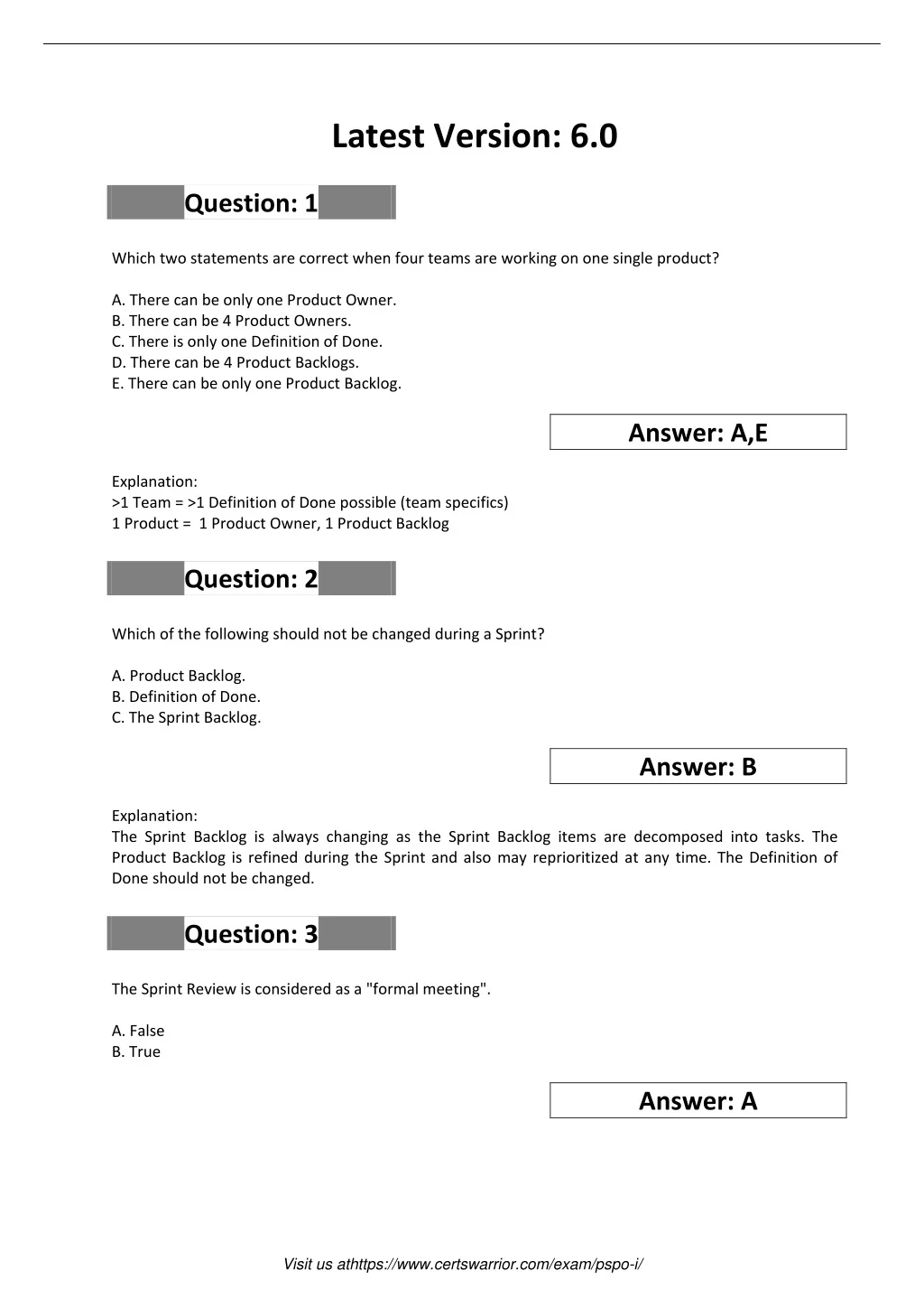 Latest Version: 6.0 Question: 1 Which two statements are correct when four teams are working on one single product? A. There can be only one Product Owner. B. There can be 4 Product Owners. C. There is only one Definition of Done. D. There can be 4 Product Backlogs. E. There can be only one Product Backlog. Answer: A,E Explanation: >1 Team = >1 Definition of Done possible (team specifics) 1 Product = 1 Product Owner, 1 Product Backlog Question: 2 Which of the following should not be changed during a Sprint? A. Product Backlog. B. Definition of Done. C. The Sprint Backlog. Answer: B Explanation: The Sprint Backlog is always changing as the Sprint Backlog items are decomposed into tasks. The Product Backlog is refined during the Sprint and also may reprioritized at any time. The Definition of Done should not be changed. Question: 3 The Sprint Review is considered as a "formal meeting". A. False B. True Answer: A Visit us athttps://www.certswarrior.com/exam/pspo-i/