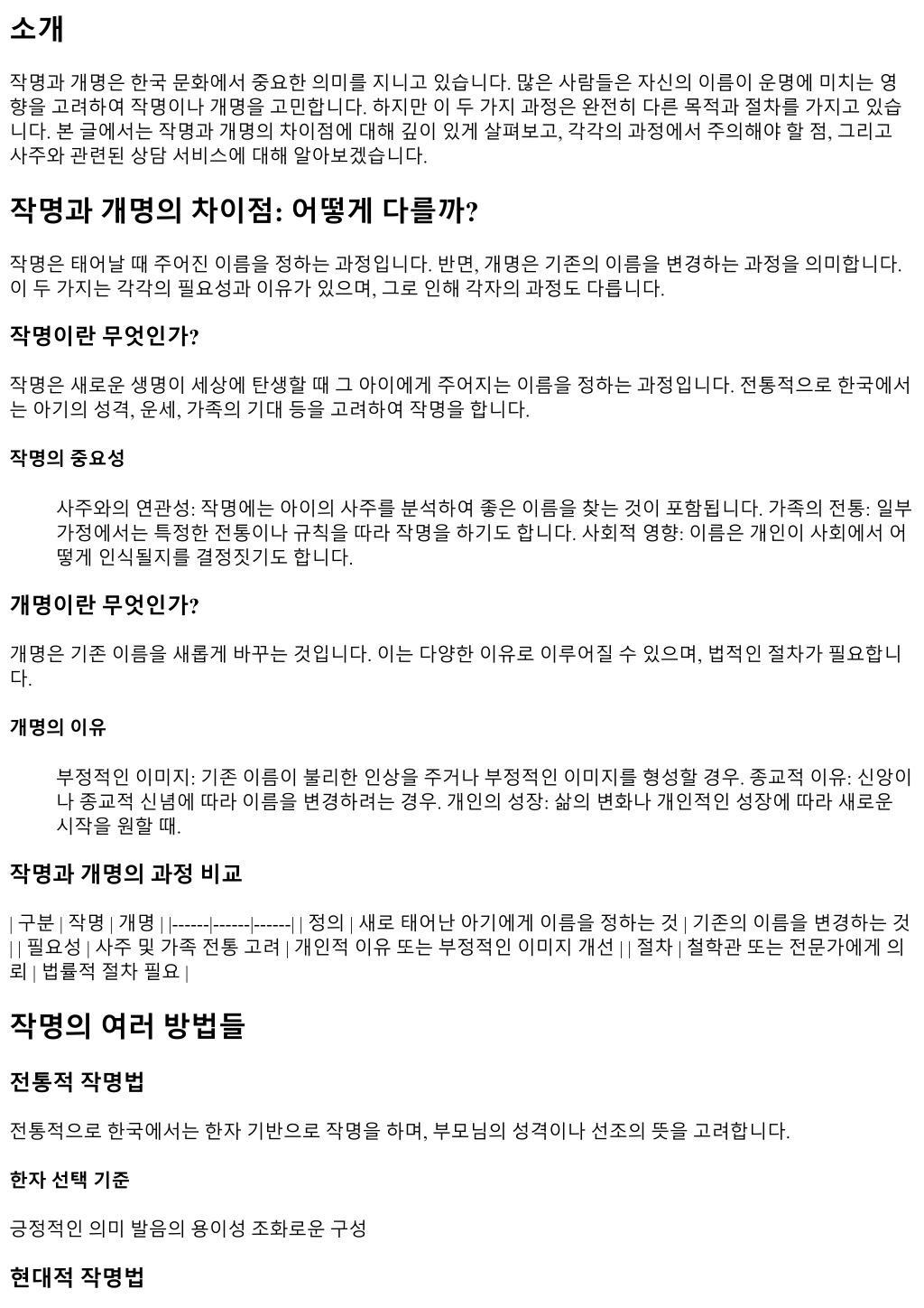 1. 소개 작명과개명은한국문화에서중요한의미를지니고있습니다. 많은사람들은자신의이름이운명에미치는영 향을고려하여작명이나개명을고민합니다. 하지만이두가지과정은완전히다른목적과절차를가지고있습 니다. 본글에서는작명과개명의차이점에대해깊이있게살펴보고, 각각의과정에서주의해야할점, 그리고 사주와관련된상담서비스에대해알아보겠습니다. 작명과개명의차이점: 어떻게다를까? 작명은태어날때주어진이름을정하는과정입니다. 반면, 개명은기존의이름을변경하는과정을의미합니다. 이두가지는각각의필요성과이유가있으며, 그로인해각자의과정도다릅니다. 작명이란무엇인가? 작명은새로운생명이세상에탄생할때그아이에게주어지는이름을정하는과정입니다. 전통적으로한국에서 는아기의성격, 운세, 가족의기대등을고려하여작명을합니다. 작명의중요성 사주와의연관성: 작명에는아이의사주를분석하여좋은이름을찾는것이포함됩니다. 가족의전통: 일부 가정에서는특정한전통이나규칙을따라작명을하기도합니다. 사회적영향: 이름은개인이사회에서어 떻게인식될지를결정짓기도합니다. 개명이란무엇인가? 개명은기존이름을새롭게바꾸는것입니다. 이는다양한이유로이루어질수있으며, 법적인절차가필요합니 다. 개명의이유 부정적인이미지: 기존이름이불리한인상을주거나부정적인이미지를형성할경우. 종교적이유: 신앙이 나종교적신념에따라이름을변경하려는경우. 개인의성장: 삶의변화나개인적인성장에따라새로운 시작을원할때. 작명과개명의과정비교 | 구분 | 작명 | 개명 | |------|------|------| | 정의 | 새로태어난아기에게이름을정하는것 | 기존의이름을변경하는것 | | 필요성 | 사주및가족전통고려 | 개인적이유또는부정적인이미지개선 | | 절차 | 철학관또는전문가에게의 뢰 | 법률적절차필요 | 작명의여러방법들 전통적작명법 전통적으로한국에서는한자기반으로작명을하며, 부모님의성격이나선조의뜻을고려합니다. 한자선택기준 긍정적인의미발음의용이성조화로운구성 현대적작명법
