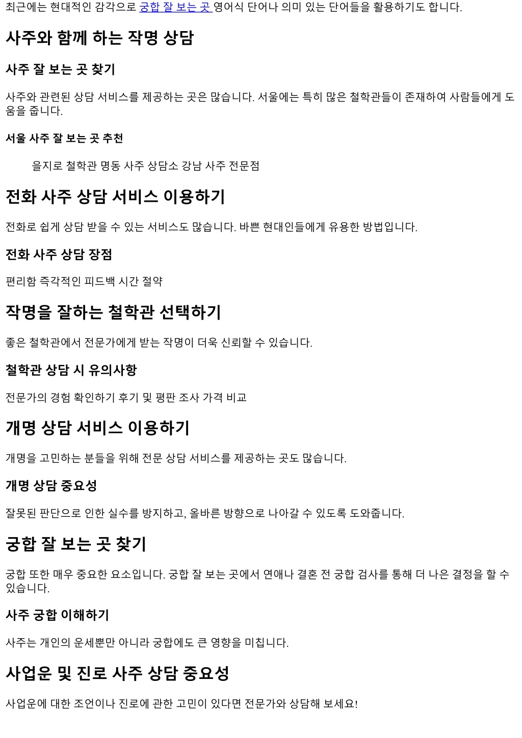 2. 최근에는현대적인감각으로궁합잘보는곳영어식단어나의미있는단어들을활용하기도합니다.최근에는현대적인감각으로궁합잘보는곳영어식단어나의미있는단어들을활용하기도합니다. 사주와함께하는작명상담 사주잘보는곳찾기 사주와관련된상담서비스를제공하는곳은많습니다. 서울에는특히많은철학관들이존재하여사람들에게도 움을줍니다. 서울사주잘보는곳추천 을지로철학관명동사주상담소강남사주전문점 전화사주상담서비스이용하기 전화로쉽게상담받을수있는서비스도많습니다. 바쁜현대인들에게유용한방법입니다. 전화사주상담장점 편리함즉각적인피드백시간절약 작명을잘하는철학관선택하기 좋은철학관에서전문가에게받는작명이더욱신뢰할수있습니다. 철학관상담시유의사항 전문가의경험확인하기후기및평판조사가격비교 개명상담서비스이용하기 개명을고민하는분들을위해전문상담서비스를제공하는곳도많습니다. 개명상담중요성 잘못된판단으로인한실수를방지하고, 올바른방향으로나아갈수있도록도와줍니다. 궁합잘보는곳찾기 궁합또한매우중요한요소입니다. 궁합잘보는곳에서연애나결혼전궁합검사를통해더나은결정을할수 있습니다. 사주궁합이해하기 사주는개인의운세뿐만아니라궁합에도큰영향을미칩니다. 사업운및진로사주상담중요성 사업운에대한조언이나진로에관한고민이있다면전문가와상담해보세요!