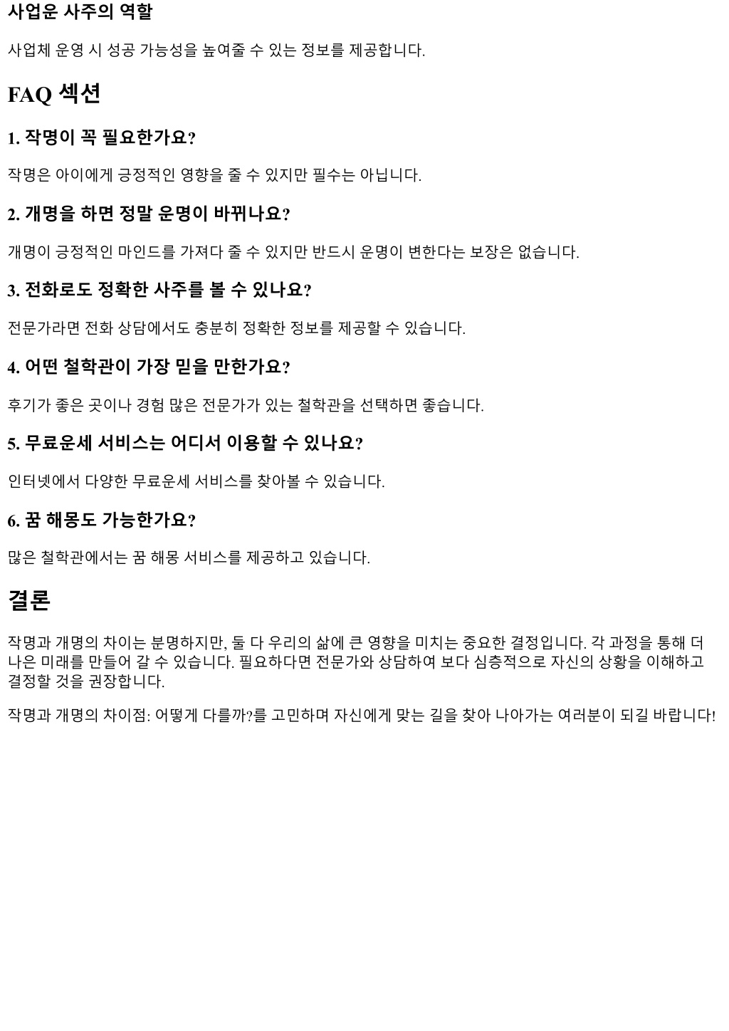 3. 사업운사주의역할 사업체운영시성공가능성을높여줄수있는정보를제공합니다. FAQ 섹션 1. 작명이꼭필요한가요? 작명은아이에게긍정적인영향을줄수있지만필수는아닙니다. 2. 개명을하면정말운명이바뀌나요? 개명이긍정적인마인드를가져다줄수있지만반드시운명이변한다는보장은없습니다. 3. 전화로도정확한사주를볼수있나요? 전문가라면전화상담에서도충분히정확한정보를제공할수있습니다. 4. 어떤철학관이가장믿을만한가요? 후기가좋은곳이나경험많은전문가가있는철학관을선택하면좋습니다. 5. 무료운세서비스는어디서이용할수있나요? 인터넷에서다양한무료운세서비스를찾아볼수있습니다. 6. 꿈해몽도가능한가요? 많은철학관에서는꿈해몽서비스를제공하고있습니다. 결론 작명과개명의차이는분명하지만, 둘다우리의삶에큰영향을미치는중요한결정입니다. 각과정을통해더 나은미래를만들어갈수있습니다. 필요하다면전문가와상담하여보다심층적으로자신의상황을이해하고 결정할것을권장합니다. 작명과개명의차이점: 어떻게다를까?를고민하며자신에게맞는길을찾아나아가는여러분이되길바랍니다!