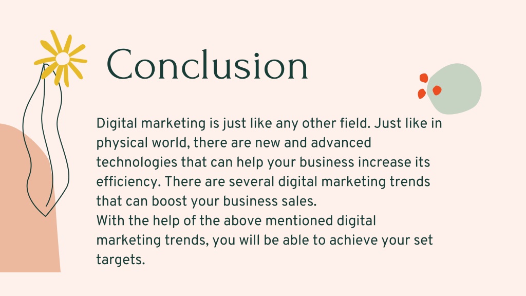 4. Conclusion Digital marketing is just like any other field. Just like in physical world, there are new and advanced technologies that can help your business increase its efficiency. There are several digital marketing trends that can boost your business sales. With the help of the above mentioned digital marketing trends, you will be able to achieve your set targets.