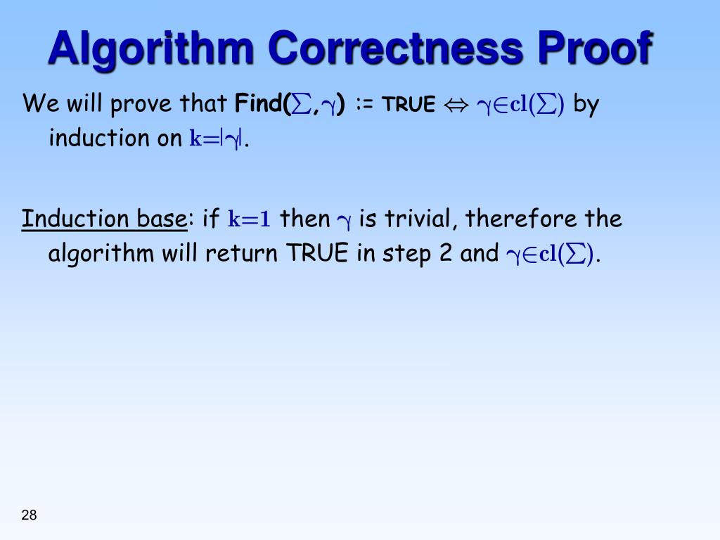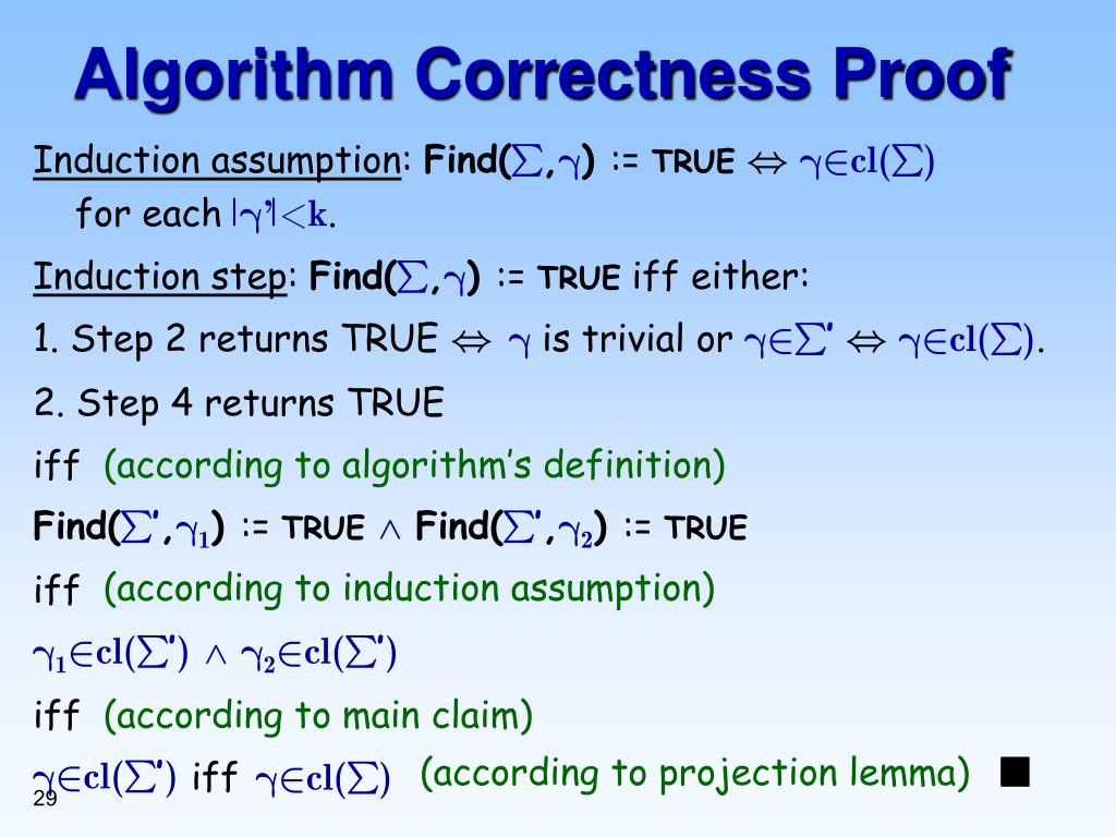 Algorithm Correctness Proof Induction assumption: Find(,) := TRUEcl() for each ’<k. Induction step: Find(,) := TRUEiff either: 1. Step 2 returns TRUE is trivial or ’cl(). 2. Step 4 returns TRUE iff Find(’,1) := TRUE Find(’,2) := TRUE iff 1cl(’)2cl(’) iff cl(’) (according to algorithm’s definition) (according to induction assumption) (according to main claim) (according to projection lemma) iffcl()