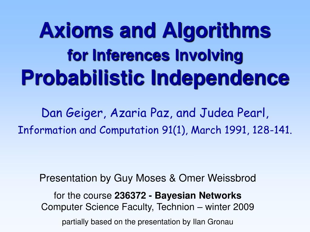 Axioms and Algorithms for Inferences Involving Probabilistic Independence. Dan Geiger, Azaria Paz, and Judea Pearl, Information and Computation 91(1), March 1991, 128-141. Presentation by Guy Moses & Omer Weissbrod