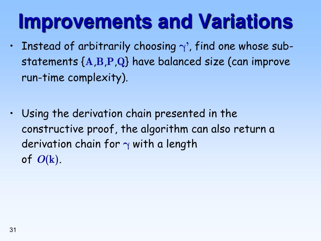 Improvements and Variations • Instead of arbitrarily choosing ’, find one whose sub-statements {A,B,P,Q} have balanced size (can improve run-time complexity). • Using the derivation chain presented in the constructive proof, the algorithm can also return a derivation chain for with a length of O(k).