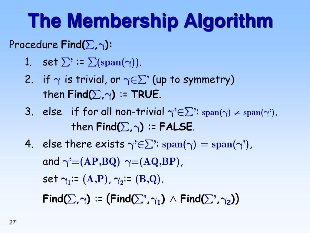 The Membership Algorithm Procedure Find(,): • set ’ :=(span()). • if is trivial, or ’ (up to symmetry)then Find(,) := TRUE. • else if for all non-trivial ’’: span() span(’), then Find(,) := FALSE. • else there exists ’’: span() = span(’), and ’=(AP,BQ) =(AQ,BP), set 1:= (A,P), 2:= (B,Q). Find(,) := (Find(’,1) Find(’,2))