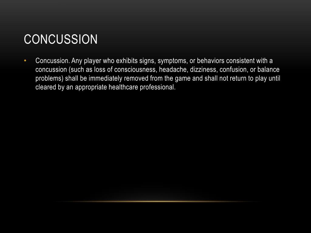 Concussion • Concussion. Any player who exhibits signs, symptoms, or behaviors consistent with a concussion (such as loss of consciousness, headache, dizziness, confusion, or balance problems) shall be immediately removed from the game and shall not return to play until cleared by an appropriate healthcare professional.