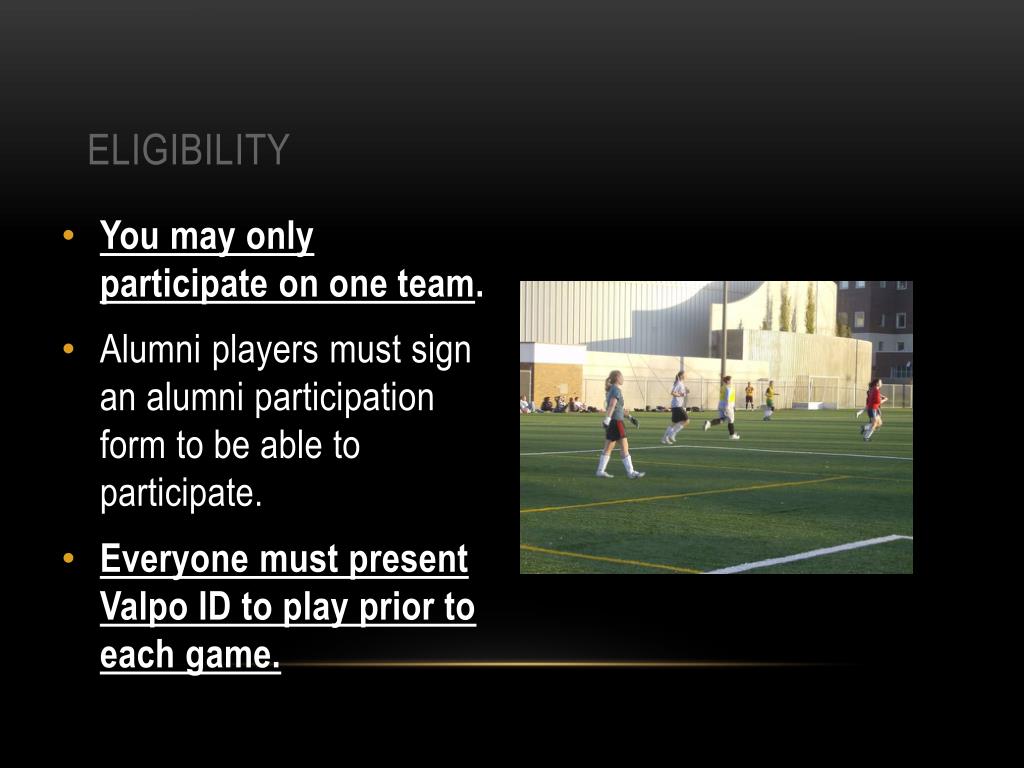 Eligibility • You may only participate on one team. • Alumni players must sign an alumni participation form to be able to participate. • Everyone must present Valpo ID to play prior to each game.