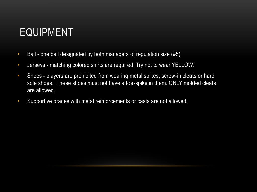 Equipment • Ball - one ball designated by both managers of regulation size (#5) • Jerseys - matching colored shirts are required. Try not to wear YELLOW. • Shoes - players are prohibited from wearing metal spikes, screw-in cleats or hard sole shoes. These shoes must not have a toe-spike in them. ONLY molded cleats are allowed. • Supportive braces with metal reinforcements or casts are not allowed.
