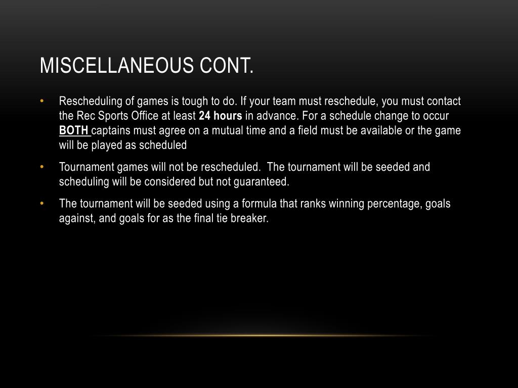 Miscellaneous cont. • Rescheduling of games is tough to do. If your team must reschedule, you must contact the Rec Sports Office at least 24 hours in advance. For a schedule change to occur BOTH captains must agree on a mutual time and a field must be available or the game will be played as scheduled • Tournament games will not be rescheduled. The tournament will be seeded and scheduling will be considered but not guaranteed. • The tournament will be seeded using a formula that ranks winning percentage, goals against, and goals for as the final tie breaker.