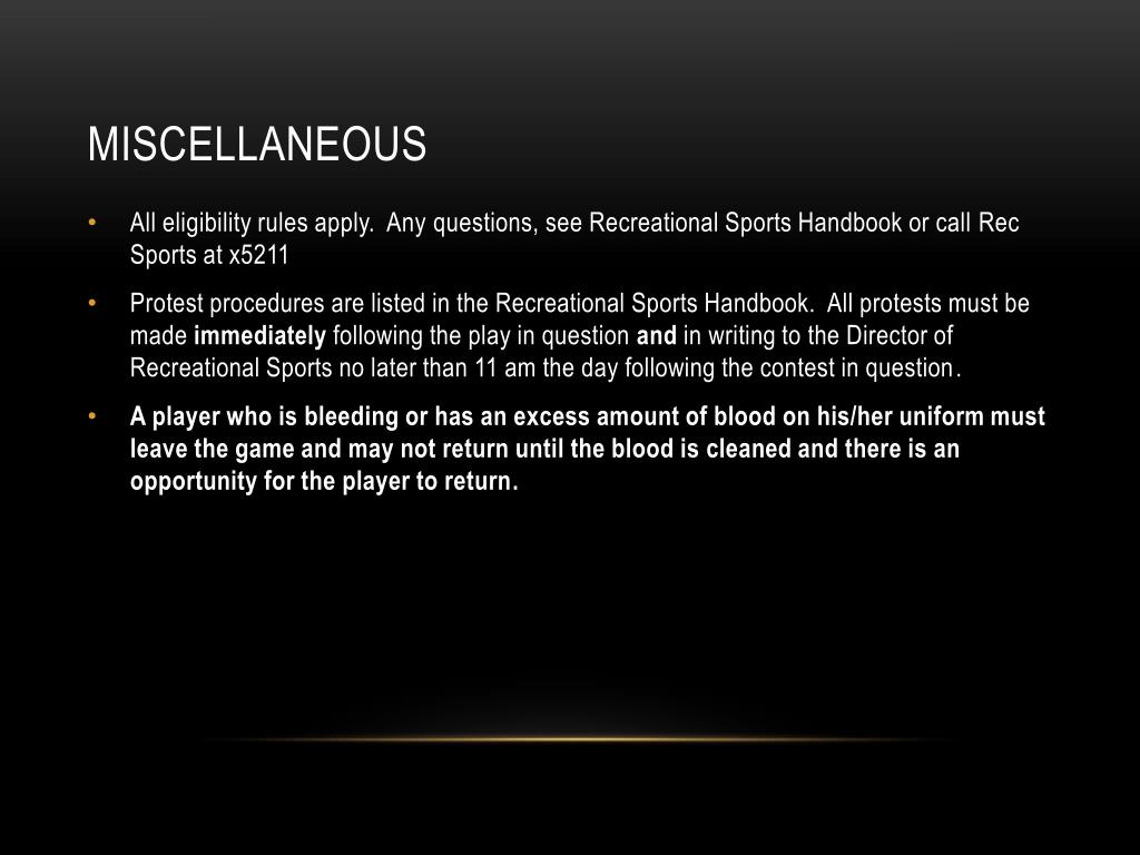 Miscellaneous • All eligibility rules apply. Any questions, see Recreational Sports Handbook or call Rec Sports at x5211 • Protest procedures are listed in the Recreational Sports Handbook. All protests must be made immediately following the play in question and in writing to the Director of Recreational Sports no later than 11 am the day following the contest in question. • A player who is bleeding or has an excess amount of blood on his/her uniform must leave the game and may not return until the blood is cleaned and there is an opportunity for the player to return.