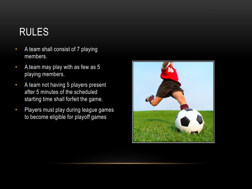 Rules • A team shall consist of 7 playing members. • A team may play with as few as 5 playing members. • A team not having 5 players present after 5 minutes of the scheduled starting time shall forfeit the game. • Players must play during league games to become eligible for playoff games
