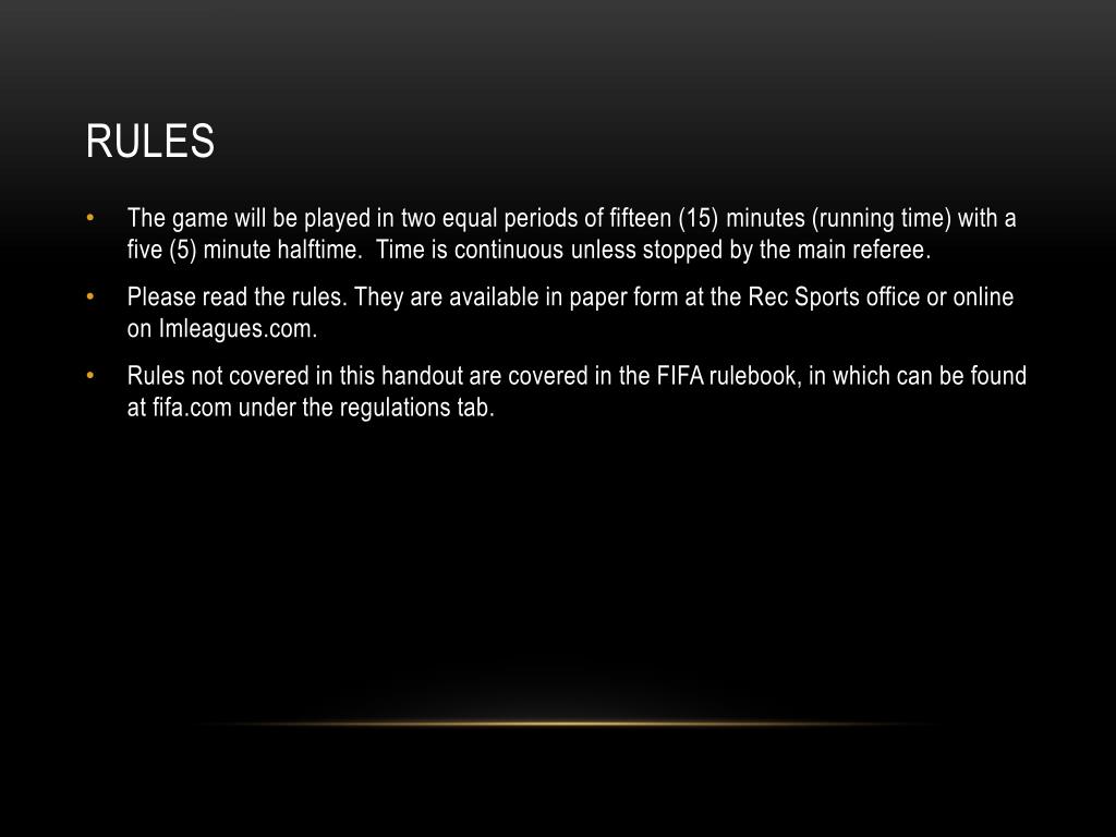 Rules • The game will be played in two equal periods of fifteen (15) minutes (running time) with a five (5) minute halftime. Time is continuous unless stopped by the main referee. • Please read the rules. They are available in paper form at the Rec Sports office or online on Imleagues.com. • Rules not covered in this handout are covered in the FIFA rulebook, in which can be found at fifa.com under the regulations tab.