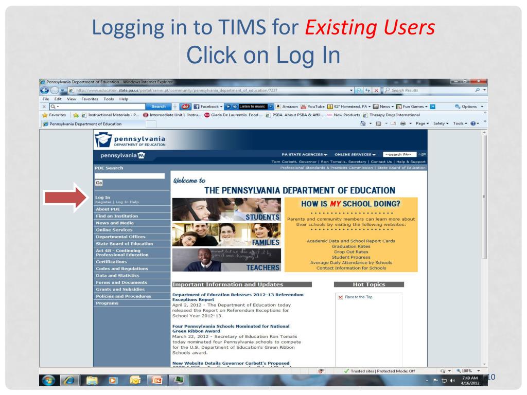 Logging in to TIMSOpen the PDE website by typing the following URL - www.education.pa.state.usClick Log Inon the top left side of the PDE web page, located just below the PDE search box.