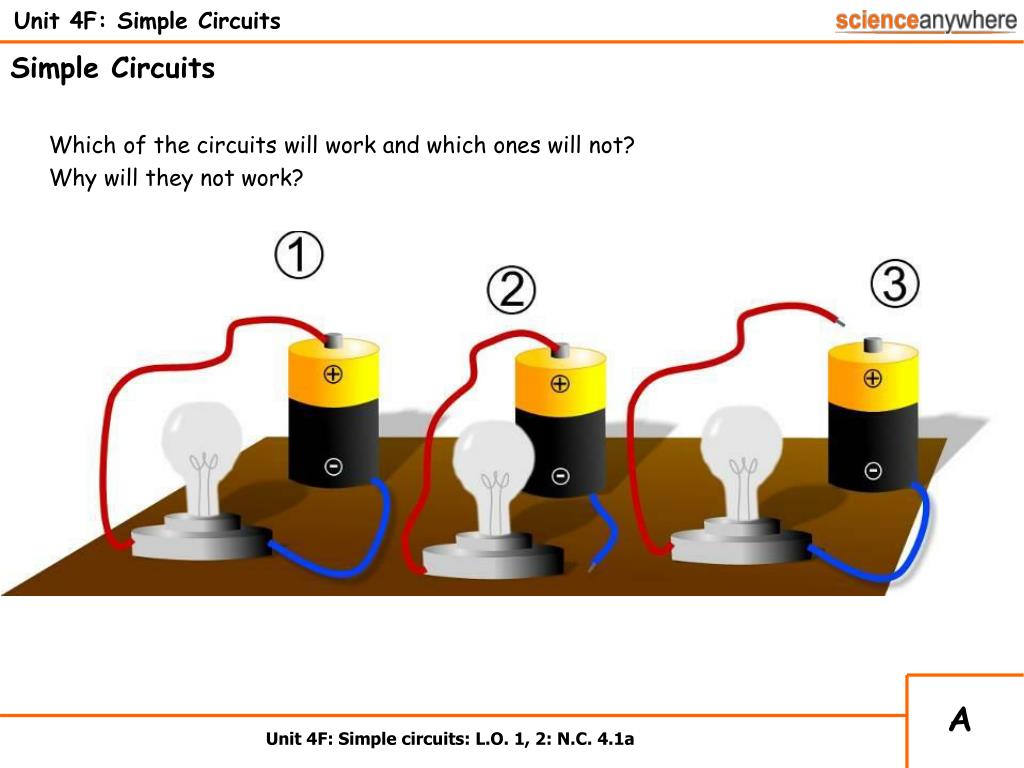 Unit 4F: Simple Circuits Simple Circuits Which of the circuits will work and which ones will not? Why will they not work? A Unit 4F: Simple circuits: L.O. 1, 2: N.C. 4.1a