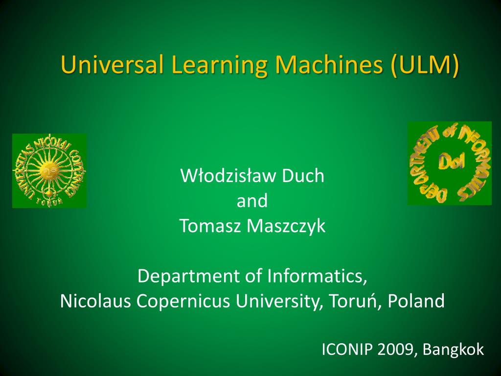 Universal Learning Machines (ULM) Włodzisław Duch and Tomasz Maszczyk Department of Informatics, Nicolaus Copernicus University, Toruń, Poland ICONIP 2009, Bangkok