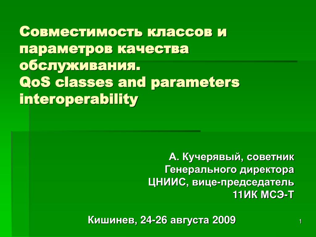 Совместимость классов и параметров качества обслуживания.QoS classes and parameters interoperability А. Кучерявый, советник Генерального директора ЦНИИС, вице-председатель 11ИК МСЭ-Т Кишинев, 24-26 августа 2009