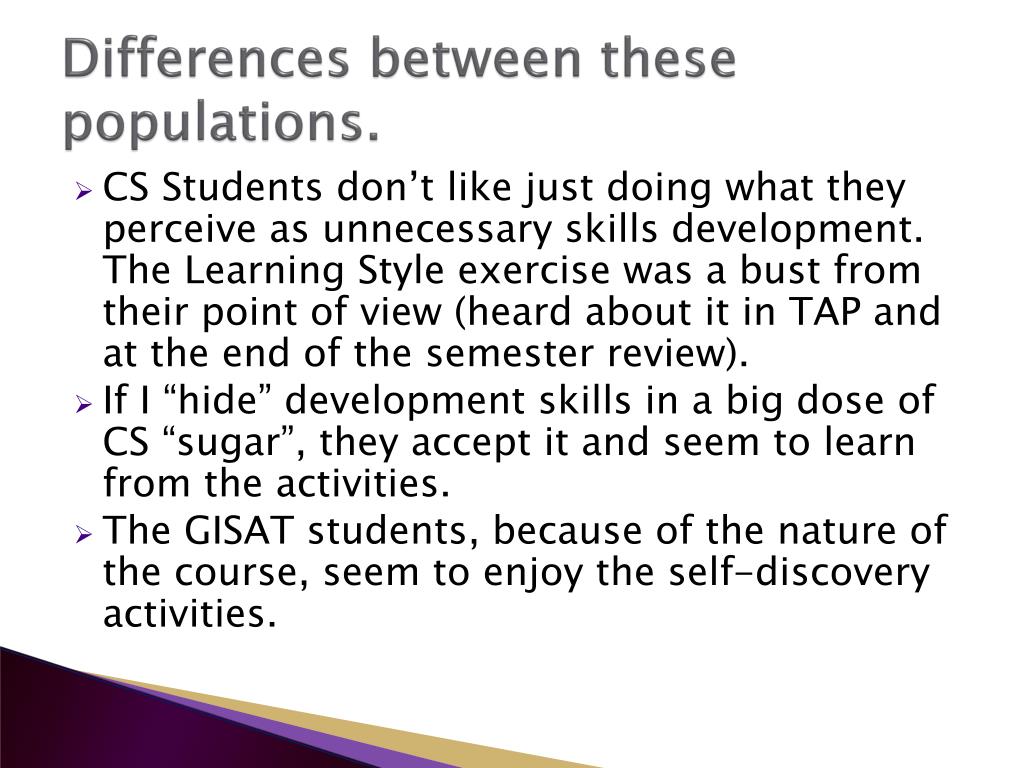 Differences between these populations. • CS Students don’t like just doing what they perceive as unnecessary skills development. The Learning Style exercise was a bust from their point of view (heard about it in TAP and at the end of the semester review). • If I “hide” development skills in a big dose of CS “sugar”, they accept itand seem to learn from the activities. • The GISAT students, because of the nature of the course, seem to enjoy the self-discovery activities.