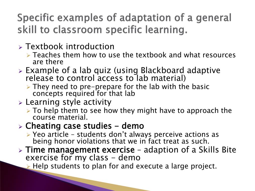 Specific examples of adaptation of a general skill to classroom specific learning. • Textbook introduction • Teaches them how to use the textbook and what resources are there • Example of a lab quiz (using Blackboard adaptive release to control access to lab material) • They need to pre-prepare for the lab with the basic concepts required for that lab • Learning style activity • To help them to see how they might have to approach the course material. • Cheating case studies - demo • Yeo article – students don’t always perceive actions as being honor violations that we in fact treat as such. • Time management exercise – adaption of a Skills Bite exercise for my class- demo • Help students to plan for and execute a large project.